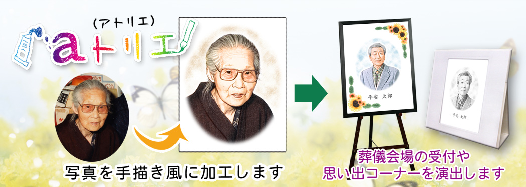 近年は、高性能の機器や画像加工ソフトも豊富にありますが、それらを使用するだけでは当社が求める仕上りにはなりません。時間をかけて培ってきた経験に基づく技法や独自の素材データを余すことなく用い、さらに高度な処理技術と写真に対する愛情とを注ぐことで、生前の面影、そして人物そのものが伝わるような写真を作り上げています。中でも、平成27年10月より開始いたしました「すご仕上げ」は、技巧を凝らした上質の遺影写真加工サービスとして、多くのお客様よりご支持いただいております。また手描き風写真加工の「aトリエ」や「aトリエ」を名刺に利用した「aトリエ名刺」なども、シーンに応じてさまざまな活用が可能なサービスとして、各方面から好評をいただいております。