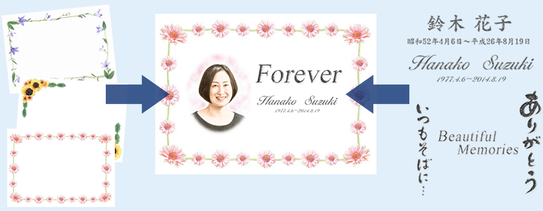 aトリエを彩るフレームやお名前・年齢や没年齢・メッセージをお選びいただけます