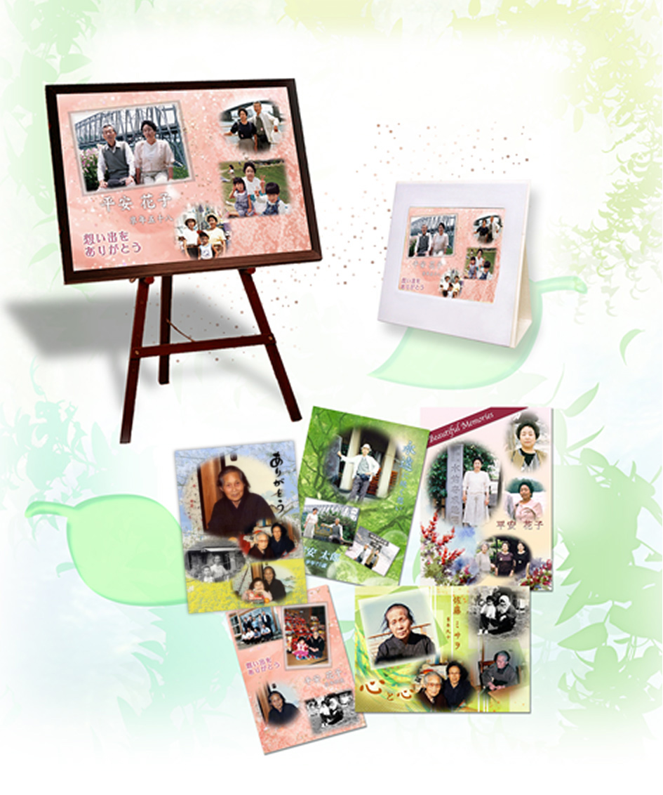 お選びいただいた故人様のお写真やデジカメのデータなどを想い出がつまった1枚のデザインにしたものです。