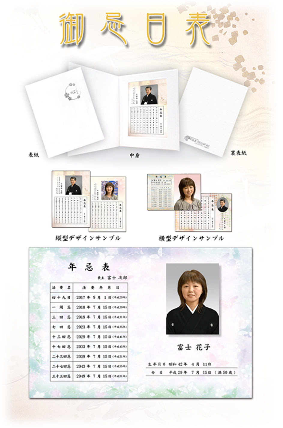 仏式タイプ・神式タイプを取り揃えております。当社で作製した遺影写真と法要年月日を一枚にし、