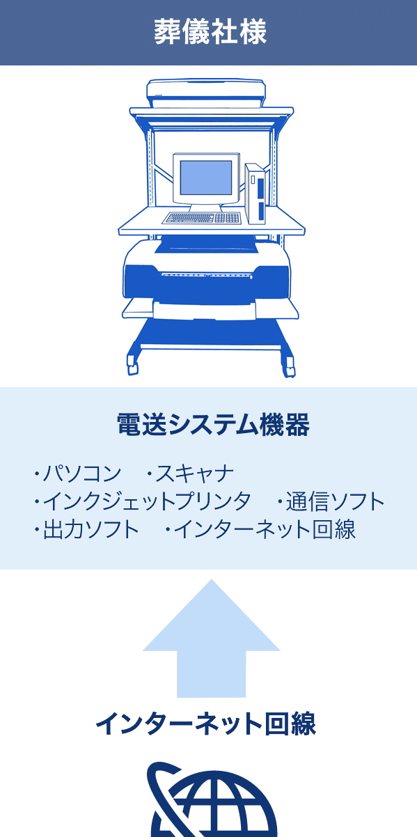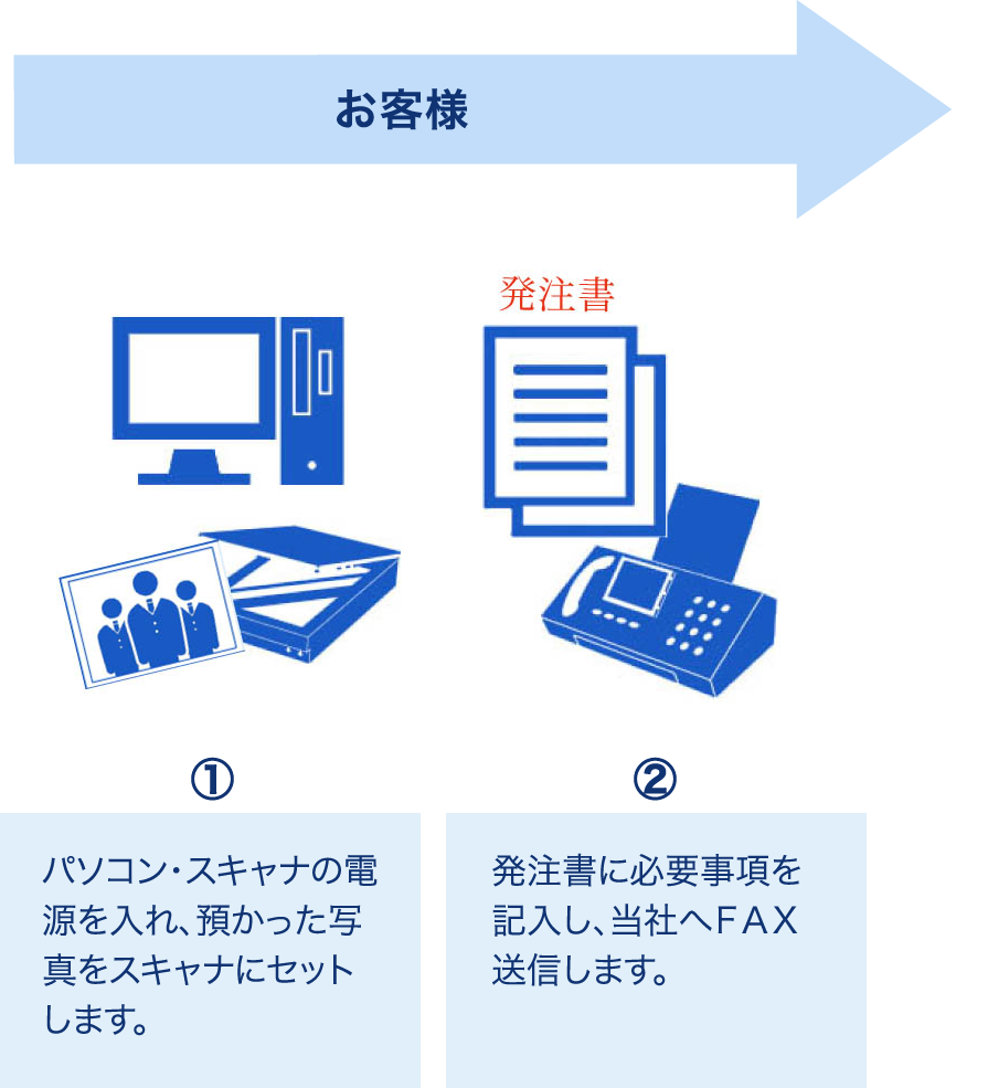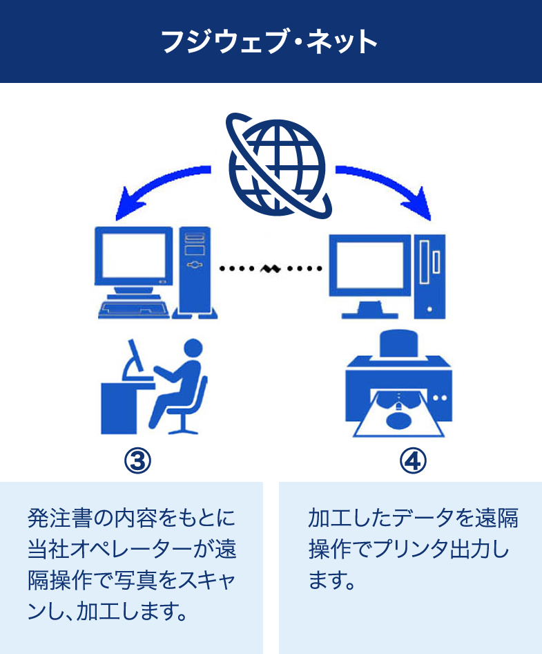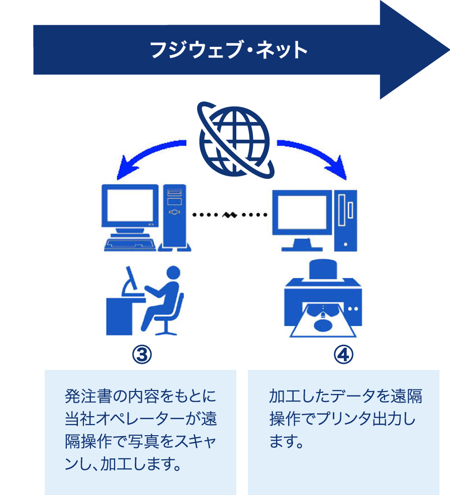 インターネット回線を使用して、写真データを転送し入出力を行います。必要な機器は当社で手配・設置をさせていただきますので、事前の準備は必要ありません。