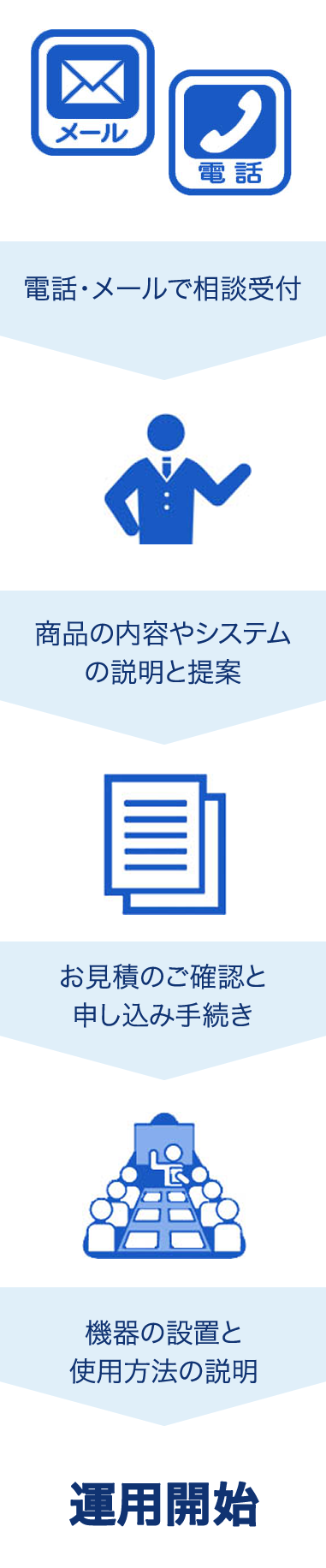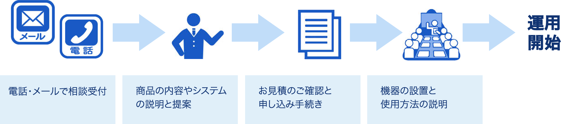 お客様には、通信回線や導入にあたっての各種手続き、機器の設置場所の確保を行っていただきます。機器の手配や設置と接続などは当社スタッフが行います。